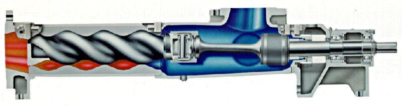 由于各螺桿的相互嚙合以及螺桿與襯筒內壁的緊密配合,在泵的吸 入口和排出口之間, 就會被分隔成一個或多個密封空間。隨著螺桿的轉動和嚙合,這些密封空間在泵的吸入端不斷形成,將吸入室中的液體封入其中,并自吸入室沿螺桿軸向連續地推移至排出端,將封閉在 各空間中的液體不斷排出,猶如一螺母在螺紋回轉時被不斷 向前推進的情形那樣,這就是螺桿泵的基本工作原理。